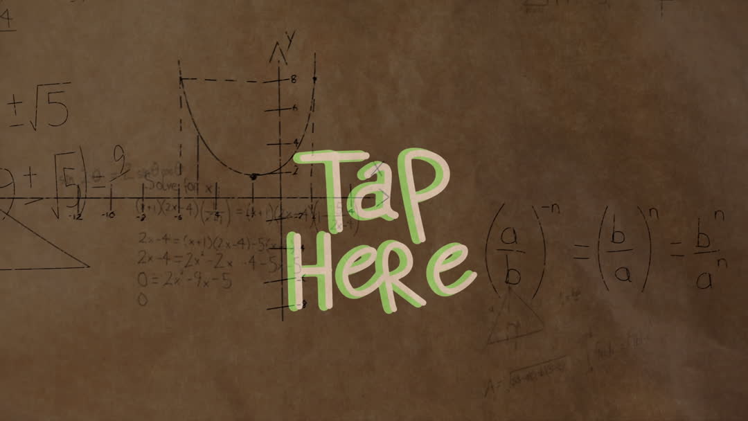 Brown background featuring handwritten mathematical formulas with playful 'Tap Here' text in center, inviting interaction. Useful for math-focused educational content or interactive digital presentations. Ideal for engaging students or audience with dynamic learning experiences, app intros, or educational platforms.