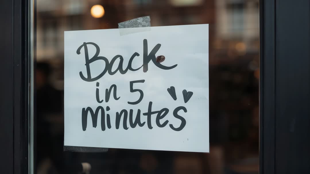 - Taping Back in 5 Minutes sign on cafe door during short customer break