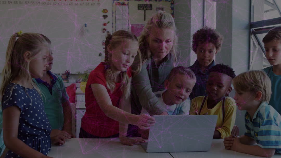 A group of diverse students intently engage with a laptop, guided by a teacher in a stimulating classroom environment. The overlay of digital network graphics symbolizing global connectivity and the future of education enhances the scene, emphasizing modern teaching methods and technological integration in learning. This can be used for articles, presentations, or sales pages covering educational technology, innovative learning environments, diversity in education, or team collaboration skills development.