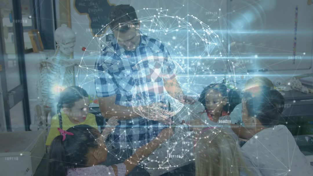 Video showcasing a teacher in a plaid shirt guiding a group of children around a projected holographic globe with digitally visualized data nodes. This reflects interactive learning and innovative education practices where students engage directly with technology. Perfect for educational promotions, technology integration in classrooms, and visualizing concepts in modern pedagogy for marketing or informational purposes.
