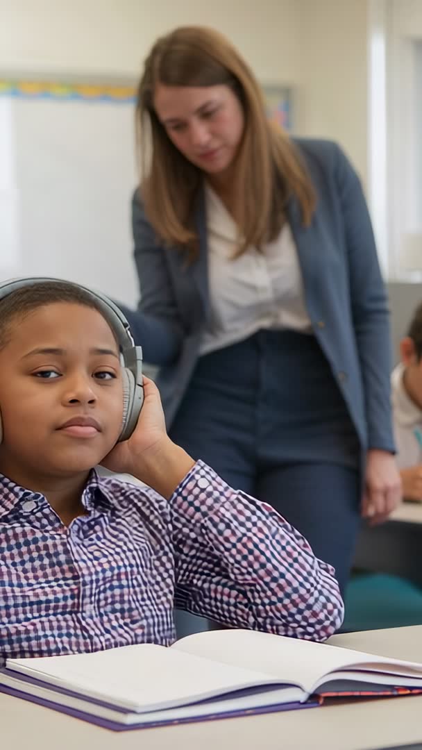 AI Generated Image. Showing young student adjusting over-ear headphones while focusing on open workbook as teacher approaches desk. Capturing quiet concentration, listening practice, and gentle teacher support during classroom activity. Useful for promoting educational technology, e-learning platforms, listening skills programs, classroom management articles, and back-to-school campaigns. Working well for vertical video ads, social media stories, app previews, online course promotion, school websites, and teacher training materials. Providing authentic visual for messaging around focused learning, inclusive classrooms, student support, and modern teaching methods.