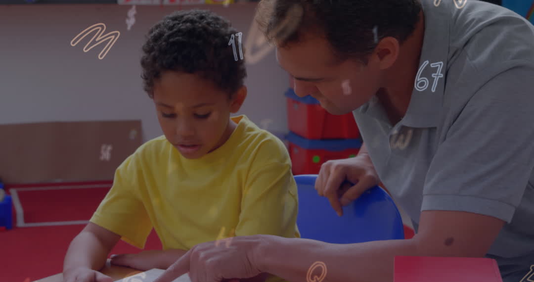 A teacher is helping a young student in a classroom setting, while transparent animated numbers and letters float over them. This visual suggests a modern and engaging learning environment, especially effective for promoting educational content related to interactive or digital learning platforms. Useful for marketing educational software, highlighting collaborative teaching techniques, or illustrating classroom education themes.