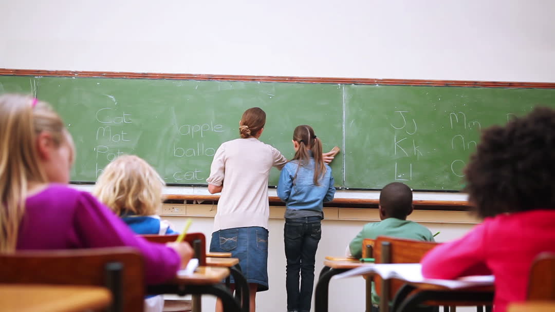 Teacher assisting young student writing on blackboard, demonstrating engaged learning. Ideal for educational materials, school brochures, and teaching resources.