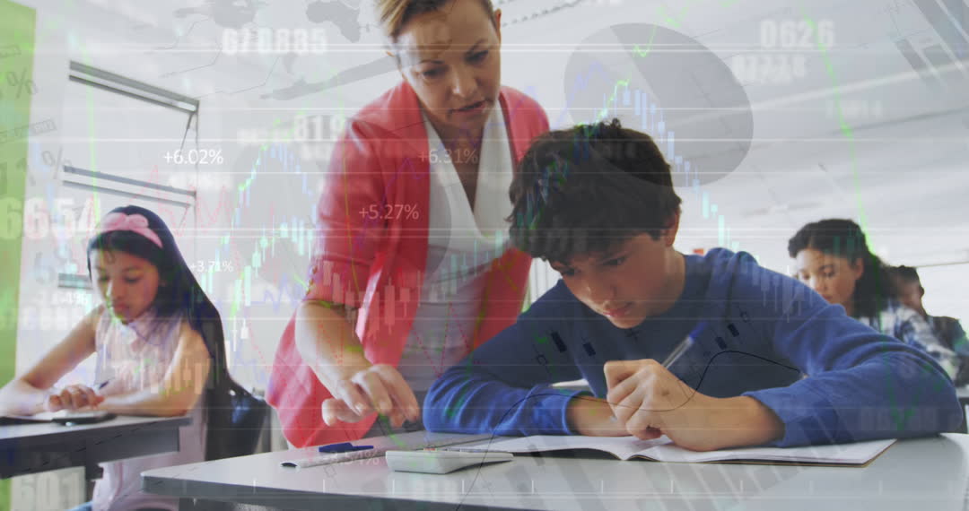 - Teacher Assists Student in Classroom with Financial Graph Overlay
