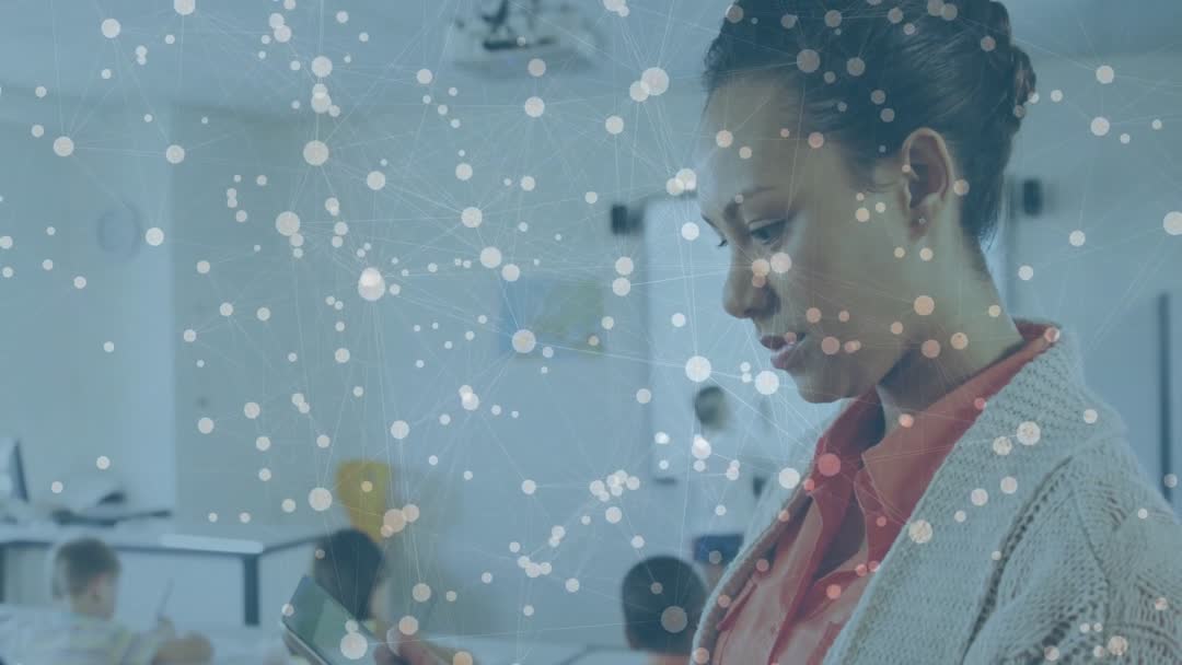 This visual showcases a teacher demonstrating digital connectivity through a tablet in a classroom environment, signifying the integration of technology into education. Network lines represent data flow and connectivity, illustrating modern teaching methods and digital learning platforms. This stock footage can be ideal for educational websites, tech in education promotions, and presentations on innovative teaching approaches.