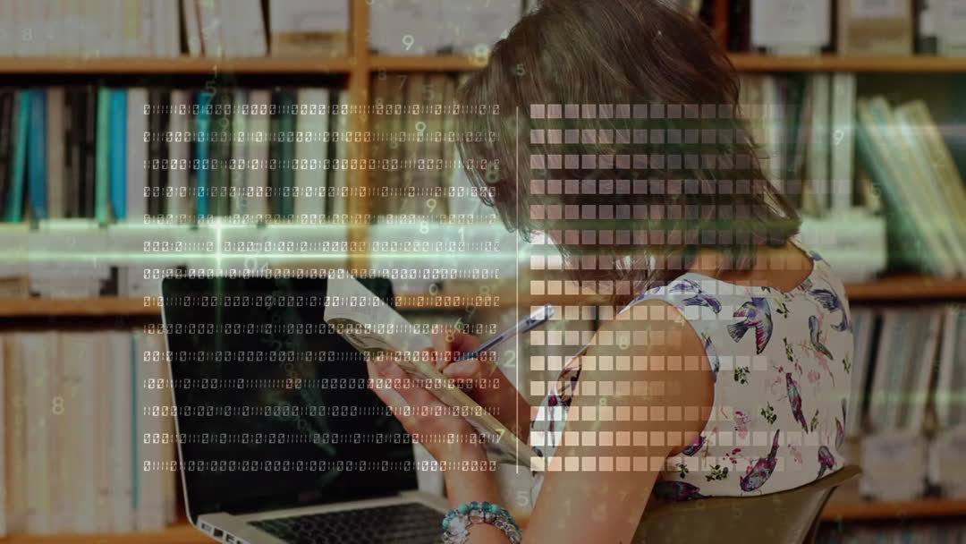 Female teacher focuses on developing professional skills through learning on a laptop while surrounded by books. Visual overlay of data emphasizes digital connection. This context is suitable for themes of modern education, research, digital transformation in learning environments, and educational technology advancements.