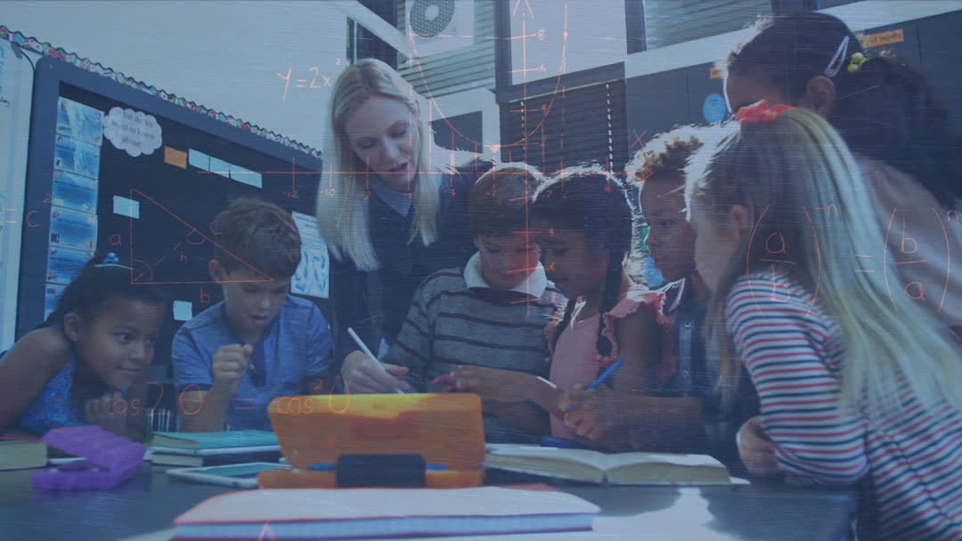 - Teacher Engages Diverse Classroom With Math Equations Overlay