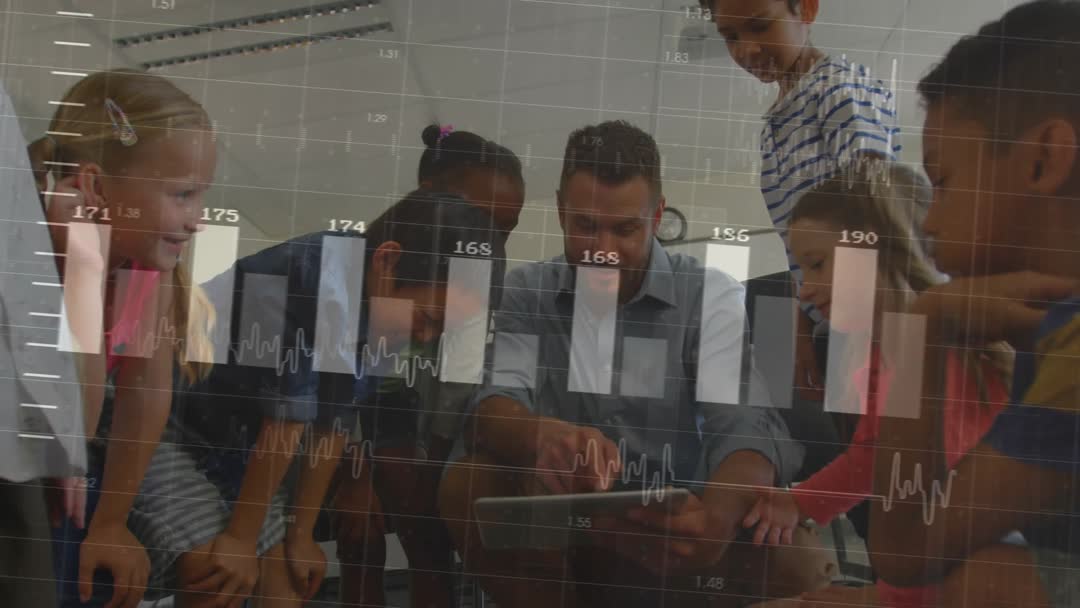 Teacher focusing on tablet featuring bar chart and waveform overlay while young students gather, creating collaborative and supportive learning vibe. Demonstrates integrating technology and interactive methods into elementary education, showcasing teacher-guided group activities for honing data literacy and analytical thinking. Imagine curriculum development presentations, academic websites, or educational tool advertising benefiting from using this engaging educational media.