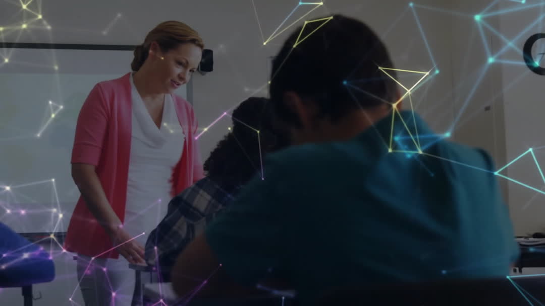 Teacher interacting with diverse schoolchildren while digital connections animation overlays. Represents technology integration in education aimed at enhancing learning experiences. Use in materials emphasizing innovative teaching methods and educational technology advancements.