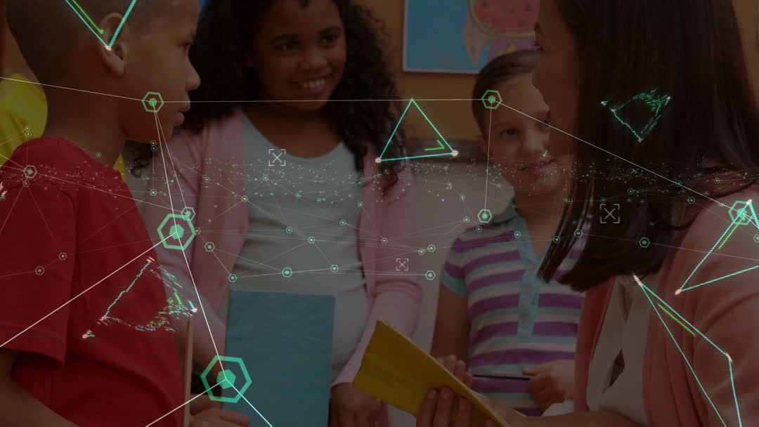 A diverse group of school children is engaging with a female teacher while digital network graphics overlay, illustrating the integration of technology in modern education. This can be used in contexts related to digital learning, technology in schools, educational innovations, and diversified learning environments.