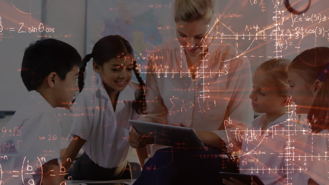 Multiracial group of students gathered around a teacher holding a tablet, engaging in educational activities with mathematical formula overlays symbolizing STEM education. Ideal for highlighting modern education approaches, innovative teaching methods, or educational technology features.