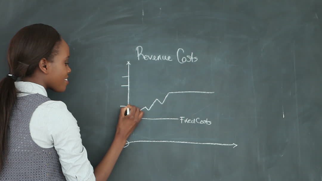 Woman teaching economic concepts through graph drawing on chalkboard, ideal for educational content, classroom learning visuals or online teaching resources.