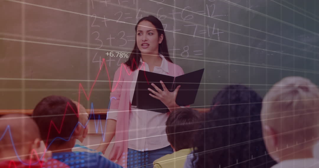 This video depicts a young teacher engaging with her students in a classroom setting, as various financial data and a growth chart are overlaid on top. Ideal for illustrating connections between education and finance, interpreting data in classroom discussions, or for use in promotional materials for financial literacy programs in schools.