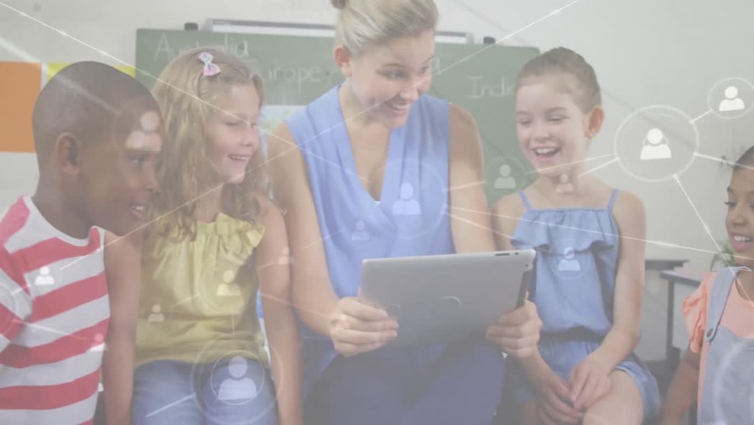 A teacher surrounded by students uses a tablet, visualized with network icons to imply digital connection and collaboration. This video represents modern teaching methods incorporating technology into classroom learning, suitable for educational materials, articles about technology in education, and teamwork concepts in school or corporate training settings.