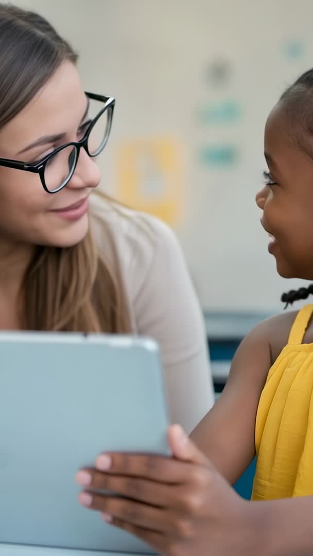 AI Generated Image. Opening scene featuring teacher guiding young girl using tablet for math, both smiling and engaging in one-on-one learning. Close-up framing emphasizing warm connection and focused attention on screen. Vertical video composition optimized for mobile and social platforms, with portrait orientation suited for reels and stories. Clip working well for e-learning promos, classroom training, teacher recruitment, education app demos, and parent outreach campaigns. Serving as hero clip on mobile landing pages, social media reels, tutorial thumbnails, or in online course intros. Color palette presenting warm tones, composition using soft background blur, attention drawing to faces and tablet interaction. Ideal for brands promoting digital learning, tutoring services, STEM outreach, educational technology campaigns, and inclusive classroom messaging.