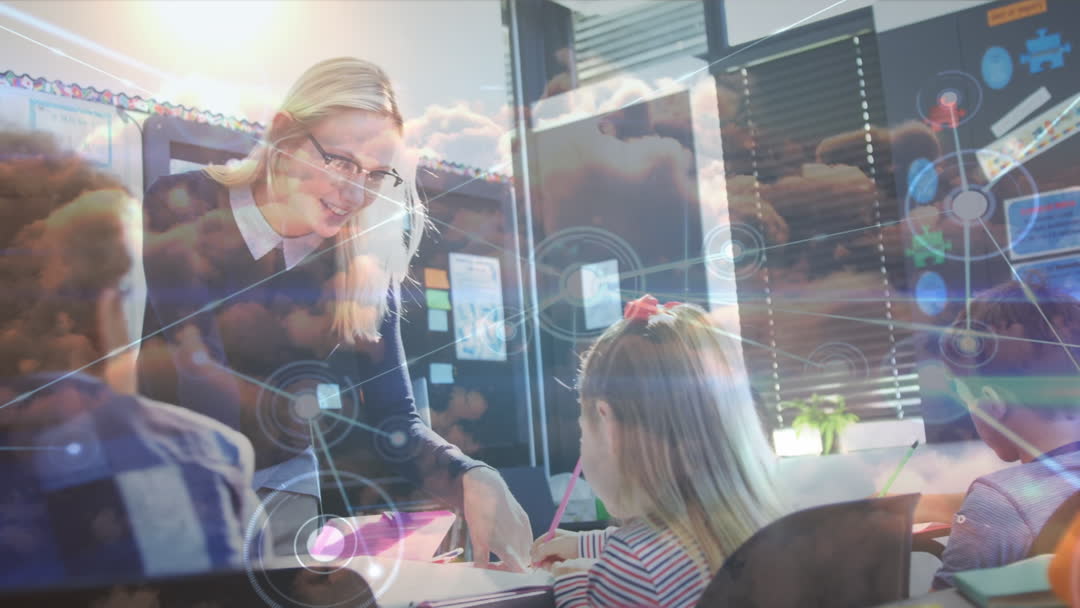 Teacher Guiding Students in Classroom with Digital Connections Overlay Video