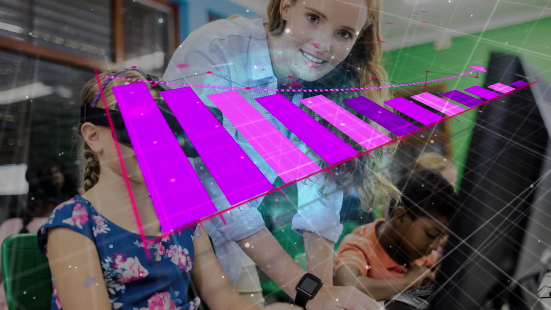 Holographic pink bars projected over a classroom scene illustrate employing technology in education. Ideal for material related to innovative teaching techniques, modern education trends, and virtual reality integration for learning opportunities.