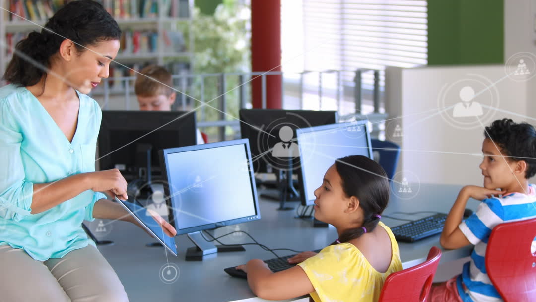 Scene shows a teacher instructing children on using computers, enhanced with overlay digital network graphics symbolizing connectivity and technology in education. Ideal for use in educational technology advertising, school promotions, and teaching resources illustrating the integration of tech in learning environments.