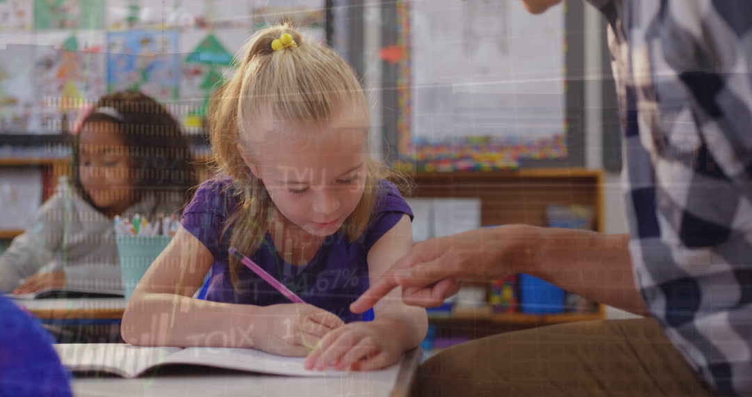 Teacher assisting young girl in writing activity, surrounded by classroom setting visuals. Overlay of line graph indicates educational growth or data visualization concept. Useful for illustrating education and mentorship, emphasizing the integration of data analytics in learning environments, or highlighting progress and development in student performance.