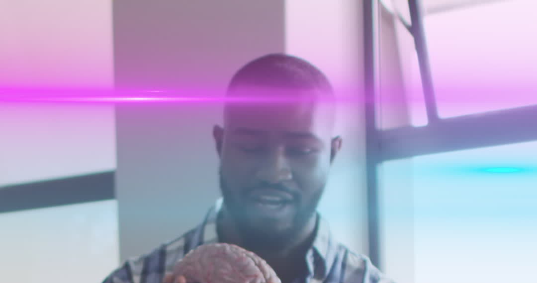 African American male teacher examining brain model in classroom. Illuminating light trails create dynamic digital effect, suggesting innovation and modern technology in educational environments. Useful for illustrating future-ready learning or advanced teaching methods.