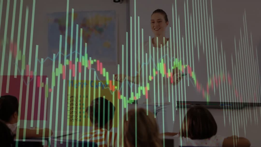 This video captures a female teacher engaging with students in a classroom environment while animated financial charts overlay the scene. Useful for content on the integration of technology in education, online learning platforms, or innovative teaching methods. Ideal for articles and presentations focused on educational growth, financial literacy, or the use of digital tools in schools.