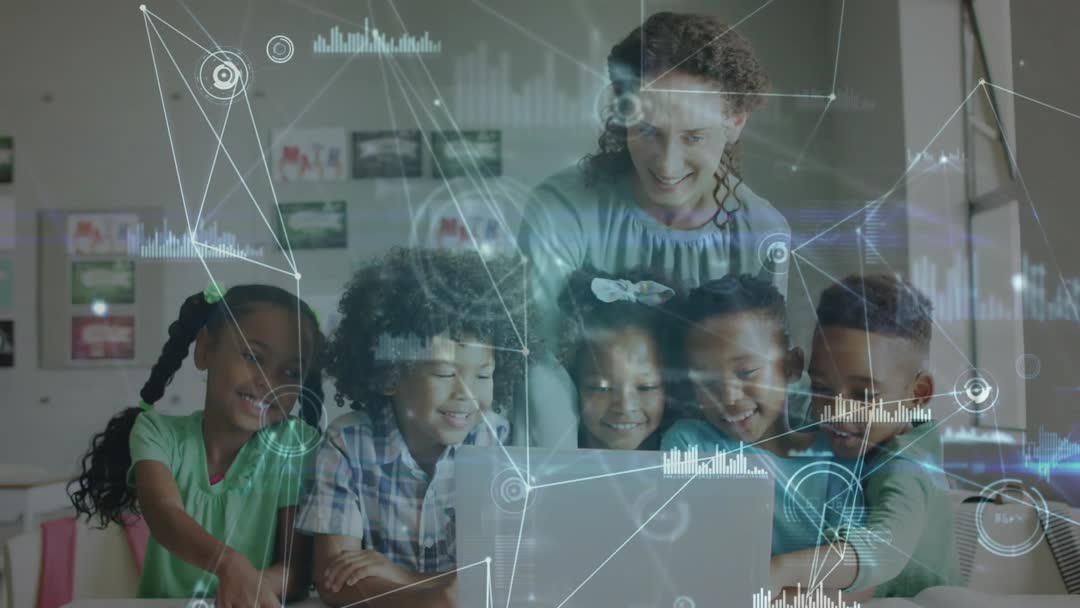 A teacher is guiding a group of students, engaging them with animated graphs superimposed on a laptop screen. This scene illustrates how digital advancements are being utilized in modern classrooms to enhance learning and engage young learners in data analysis and collaboration. Perfect for content related to innovative teaching methods, technology in education, or digital learning environments.