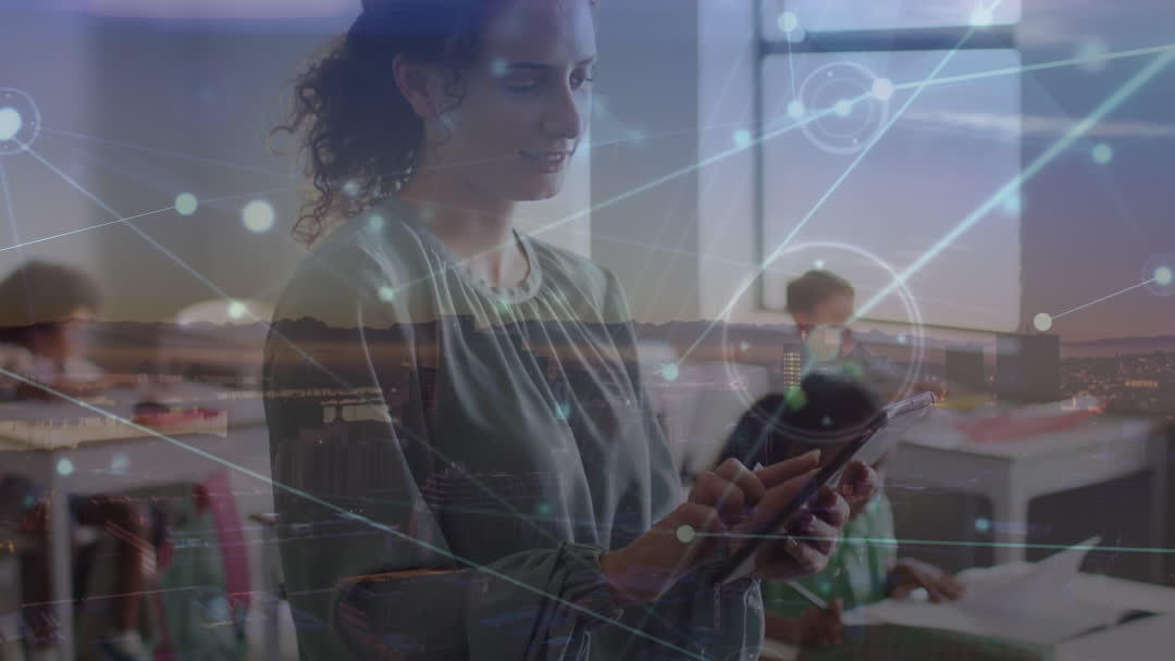 Teacher standing in classroom engaging digital network technology emphasizes transformation in modern education. Ideal for highlighting advancements in educational tools, showcasing international virtual learning connectivity, and inspiring use of tech in teaching practices.