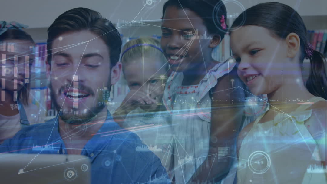 Teacher Using Tablet with Diverse Students and Digital Data Overlay Video