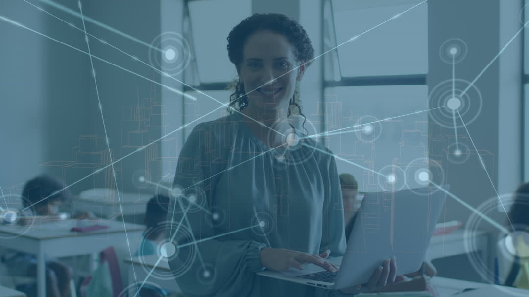 Teacher standing in a classroom holding a laptop, while virtual network connections overlay scene, indicating integration of technology in education. Suitable for illustrating articles on digital learning, technological advancement in classrooms, diverse educational approaches, or modern teaching methods.