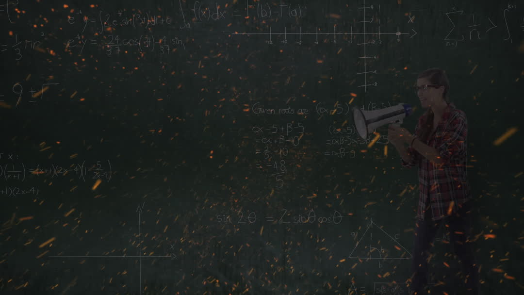 This video features a teacher holding a megaphone, standing next to chalkboard with mathematical equations and sparks flying around. Ideal for educational contexts highlighting creativity, inspiration, or innovative teaching methods. Can be used for school promotions, educational blogs, science events, or technology-driven learning articles. The mix of fire sparks and math hints at dynamic and engaging communication in education.