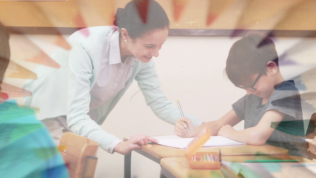 Teacher assisting young student at desk while colorful animation of crayons appears over scene. Illustration of creative learning environment suitable for use in educational website materials or teaching resource brochures aiming to highlight engagement in classrooms.