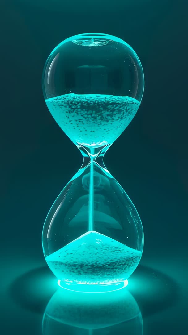 AI Generated Image. Vertical cinematic video showing glowing teal hourglass with sand flowing between chambers, creating hypnotic slow-motion countdown. Minimal gallery-style composition with reflective glass and underlighting generating modern neon mood. Serving as visual metaphor for time, deadline, urgency, patience, and mindfulness. Perfect for background on websites, app intros, social media reels, corporate presentations, explainer videos, wellness and meditation content, advertising about urgency or longevity. Providing loopable format for seamless playback on vertical platforms and mobile-first channels. Allowing color grading and speed adjustments for branding consistency and mood tuning. Delivering high-contrast cyan palette that pairs well with dark interfaces and minimal typography.