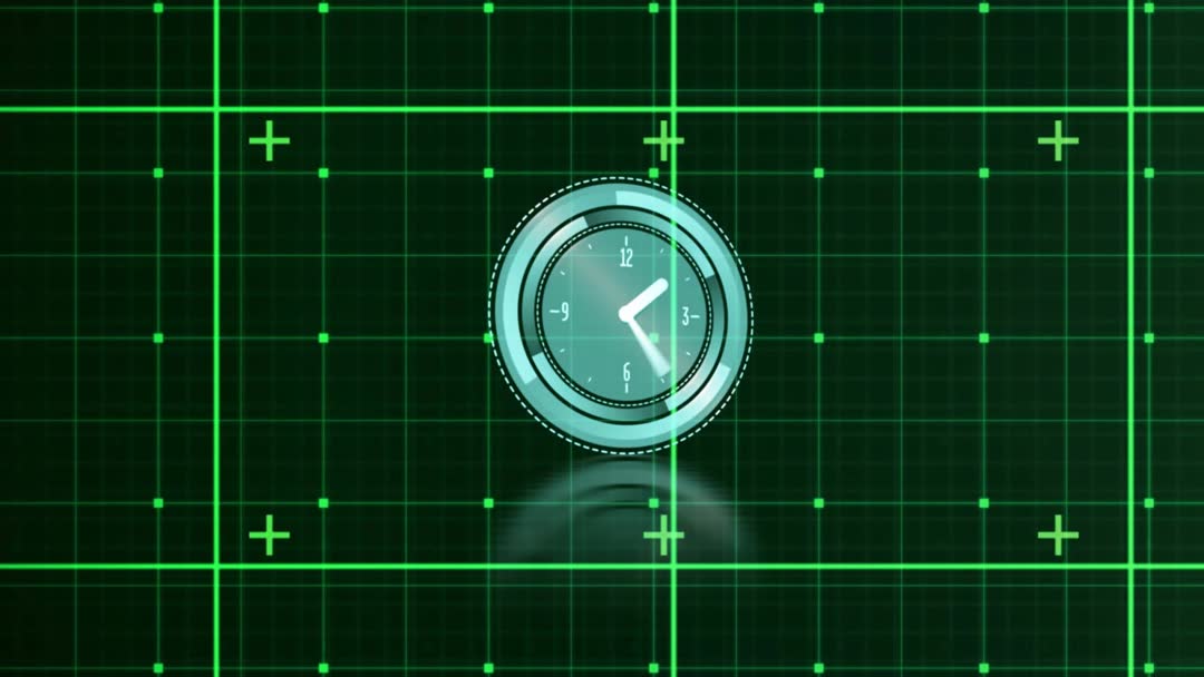 - Teal HUD clock rotating on neon grid with expanding rings and scanning crosshairs