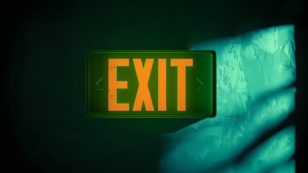 AI Generated Image. Showing backlit EXIT sign center-frame, teal light sweeping across textured plaster wall and casting elongated shadows while revealing peeling paint and cracked surface. Orange letters glowing against green panel, creating cinematic teal-orange contrast and moody atmosphere. Working well for horror or thriller openers, urban exploration sequences, safety signage demonstrations, and architectural or design presentations. Serving as background for title cards, social media reels, website hero banners, motion graphic overlays, and training videos about emergency procedures. Allowing smooth looping or slow parallax pans, leaving negative space for text or logo placement, and supporting color grading to match teal-orange palettes.