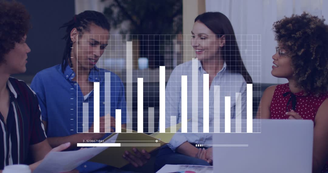 This video captures a diverse group of business professionals discussing quarterly performance with animated rising bar charts and flipping folders. Ideal for illustrating teamwork in modern office environments, strategic planning, data-driven decisions, or marketing corporate collaboration technologies. Useful for presentations, business blogs, or company profile enhancements.