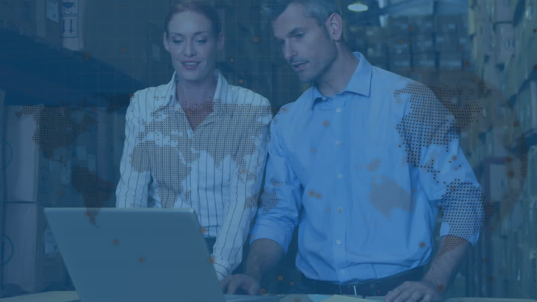 Two colleagues stand in a warehouse setting, intently studying a laptop. A digital overlay of world map suggests a global business focus, implying strategy planning or logistics coordination. This visual can effectively convey themes of international commerce, data handling, and teamwork, ideal for business or technology-related content, especially in sectors like supply chain management or global marketing strategies.