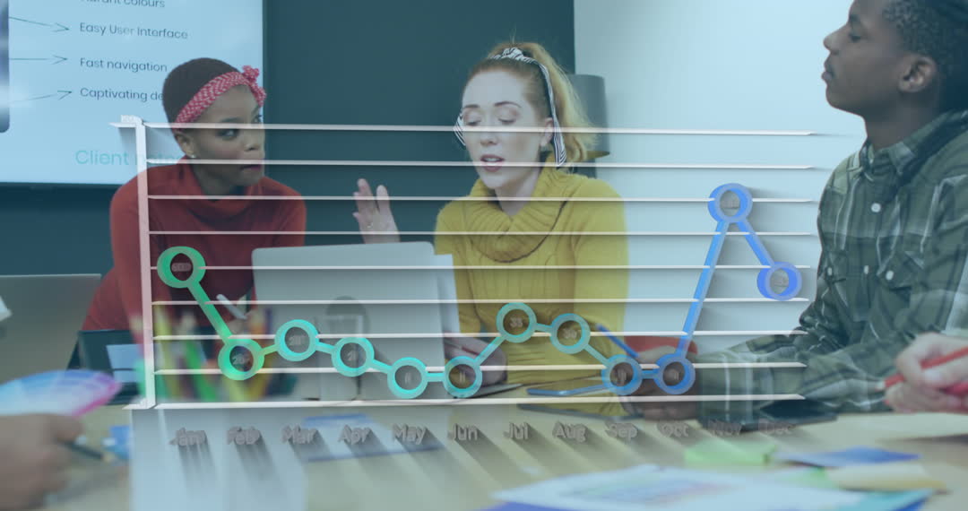 Colleagues collaborate on data analysis in a corporate setting. Visible digital graph overlays suggest discussions focused on statistical data interpretation. Ideal for use in presentations on workplace diversity, analytical skill development, and modern office technology use.