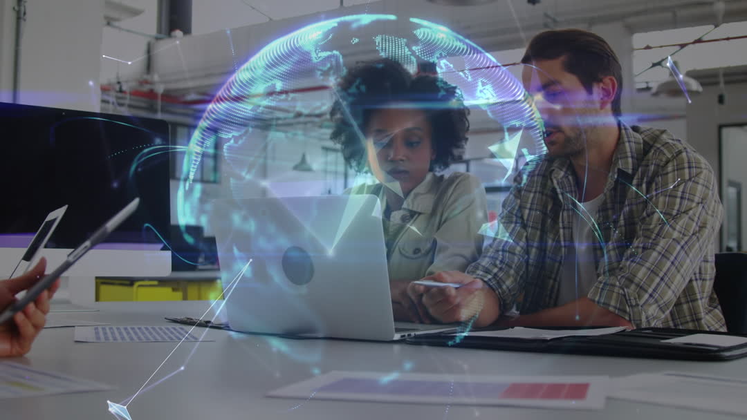 This scene depicts a diverse team analyzing digital data overlaid with a holographic globe interface, symbolizing global connectivity and advancing technology. This video is ideal for illustrating themes such as modern business practices, innovative solutions, teamwork in a digital age, and the impact of technology in corporate environments. Suitable for use in advertisements, corporate presentations, blog posts on innovation, and marketing materials aimed at tech industries.