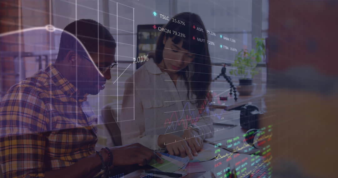 Scene shows a diverse man and woman collaborating in a busy office environment, analyzing key financial figures. Overlapping digital graphs and charts indicate real-time data monitoring, highlighting corporate decision-making and strategic planning. Ideal for visuals in business presentations, educational modules on finance, or articles about workplace diversity and collaboration.