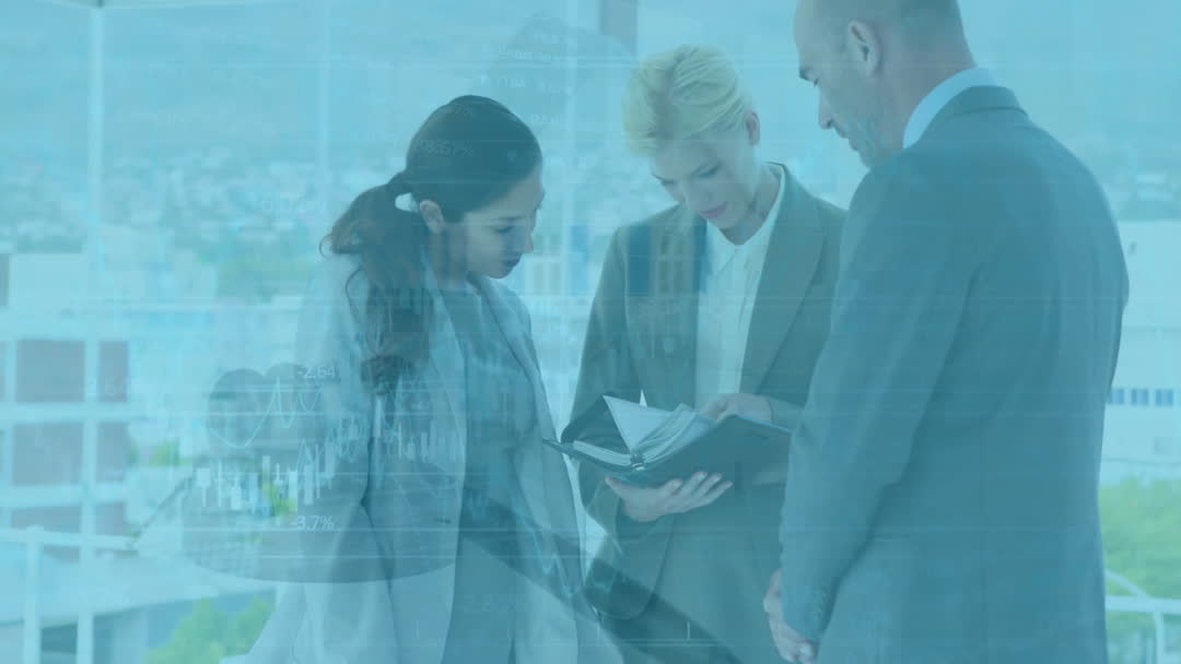 Team Analyzing Financial Data in Corporate Setting with Digital Overlay Video