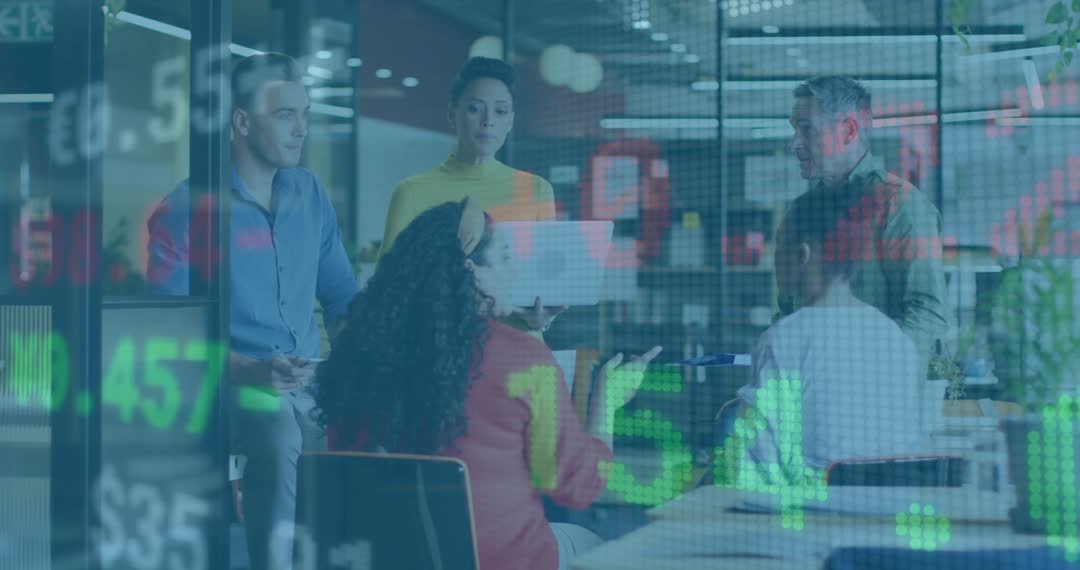 Team Analyzing Financial Data Overlays in Modern Workplace Video