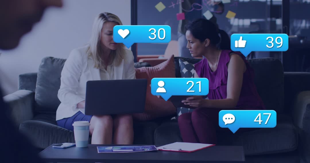 Two team members are collaborating in a contemporary office environment while analyzing social media engagement metrics indicated by floating icons displaying likes, comments, and followers. This representation highlights the modern business reliance on digital interaction and analytics. Ideal for content regarding teamwork, social media strategies, digital marketing, and corporate communication.