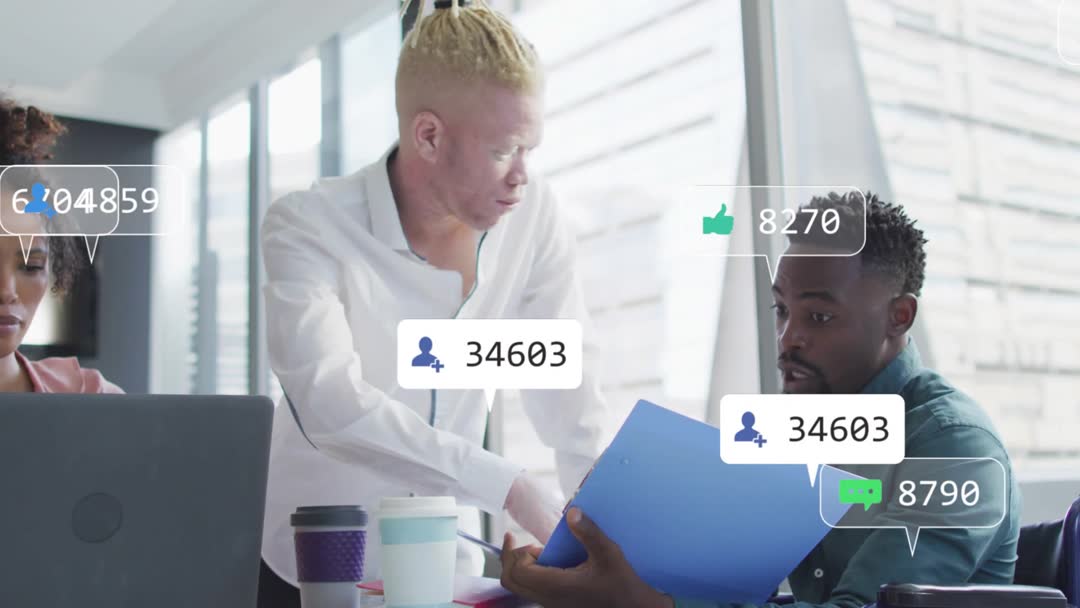 Team Analyzing Social Media Metrics with Live Engagement Overlay in Office Video