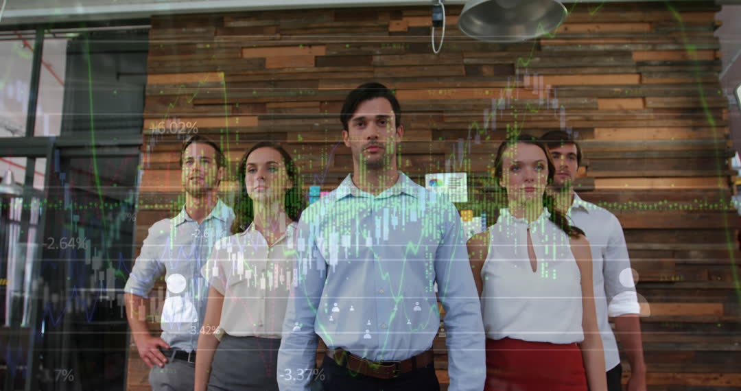 Diverse business team in a modern office, enveloped by graphs depicting stock market data. Suitable for articles on financial strategies, teamwork in corporate environments, or modern business trends. Highlights concepts of growth, digital transformation, and data-driven decision making.