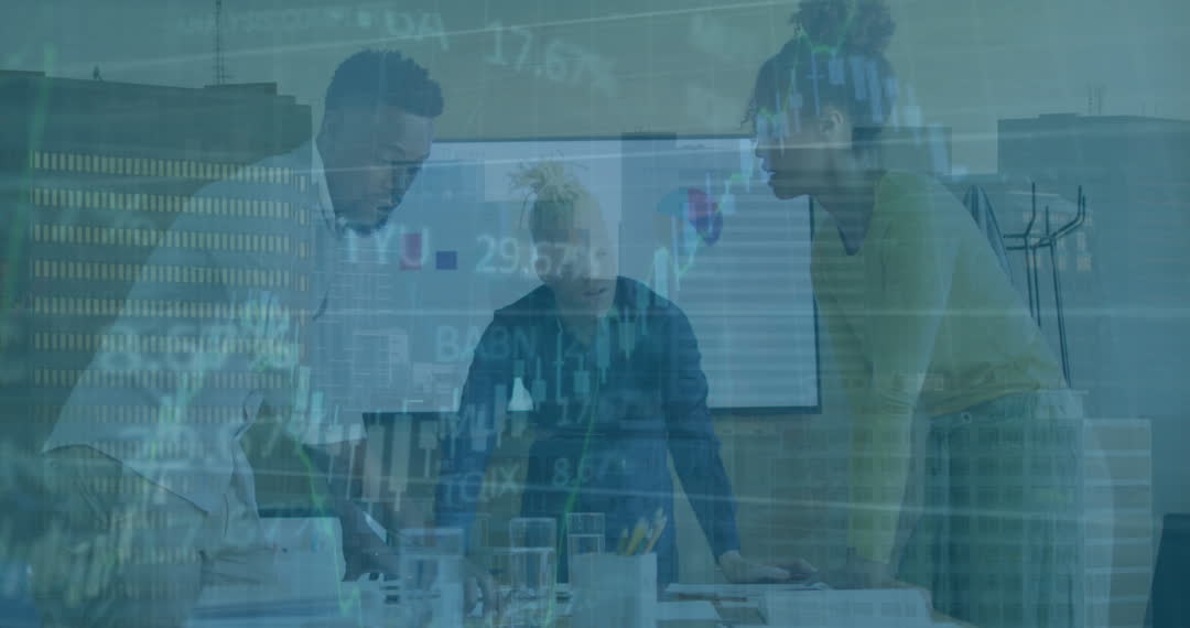 Three diverse colleagues intensely discussing stock market trends and financial strategies against a dynamic data background. Ideal for depicting teamwork, innovation, and strategic planning in business and finance contexts. Useful for presentations, articles, and websites focusing on economic analysis, financial services, or collaborative business environments.