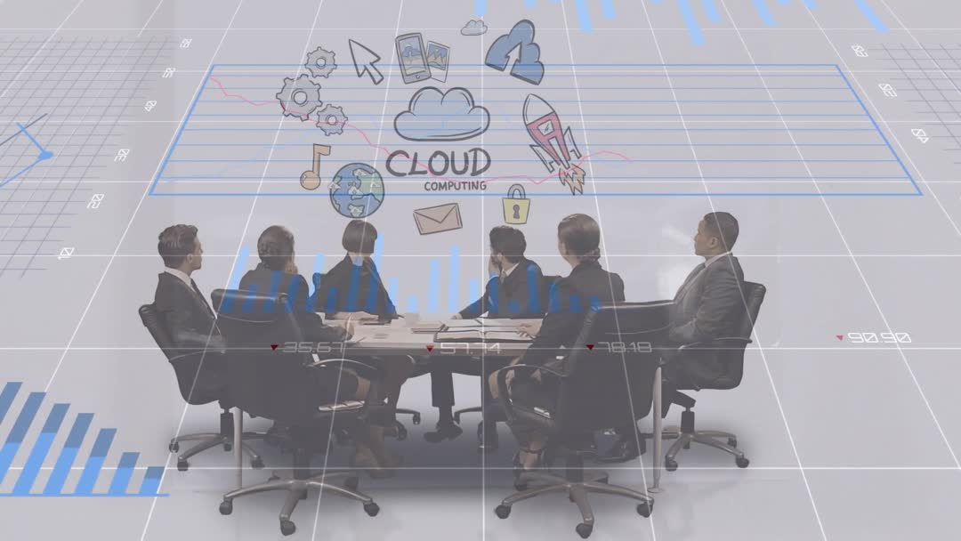 Business professionals gather for a meeting in an office environment, discussing cloud computing and technology innovations. Ideal for illustrating corporate strategies, teamwork, and technological advancements in business presentations and reports.