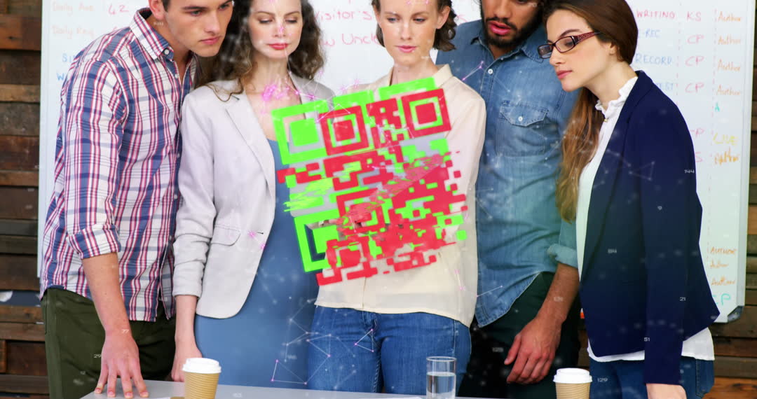 A group of business colleagues are gathered around a digital projection of a QR code, symbolizing innovative discussions and collaborative efforts in a modern office setting. With a focus on technology and problem-solving, this video highlights a dynamic workspace filled with creative ideas. Suitable for content related to digital innovation, teamwork in technology-driven environments, or articles discussing modern business collaboration techniques.