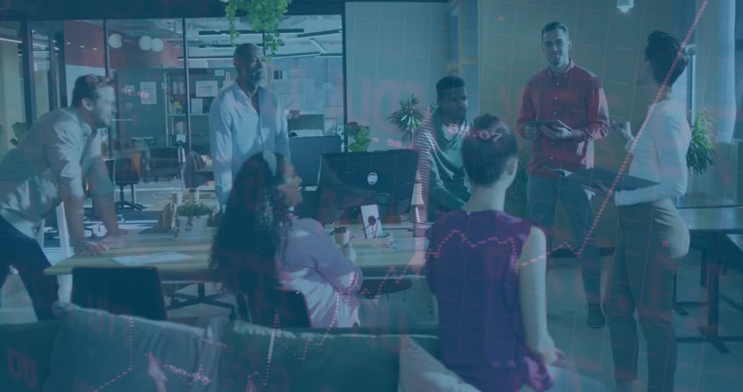 Diverse group collaborating during business meeting, discussing financial data and market trends as animated stock graphs seamlessly project over table. Ideal for visualizing marketing strategy, teamwork dynamics or contemporary workplace environment in corporate presentations and promotional materials.