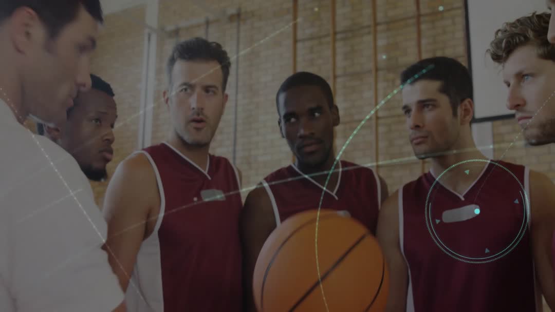 Several basketball players surround a coach, displaying an engaging combination of physical sports and futuristic impressions. Digital overlays give strategic significance to the basketball and surrounding environment, suggesting tools of modern coaching. This scene conveys motivation and teamwork, making it perfect for content focusing on sports strategy, leadership, or technology-infused training methods.