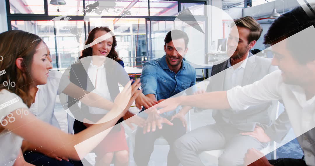 Group of business people expressing team spirit and unity by assembling hands overlaid with financial data graphics in a modern office. Ideal for themes related to corporate success, tech-driven analytics, collaborative work environments, and the global business community. Perfect for use in digital marketing materials, business website designs, and financial service promotions.